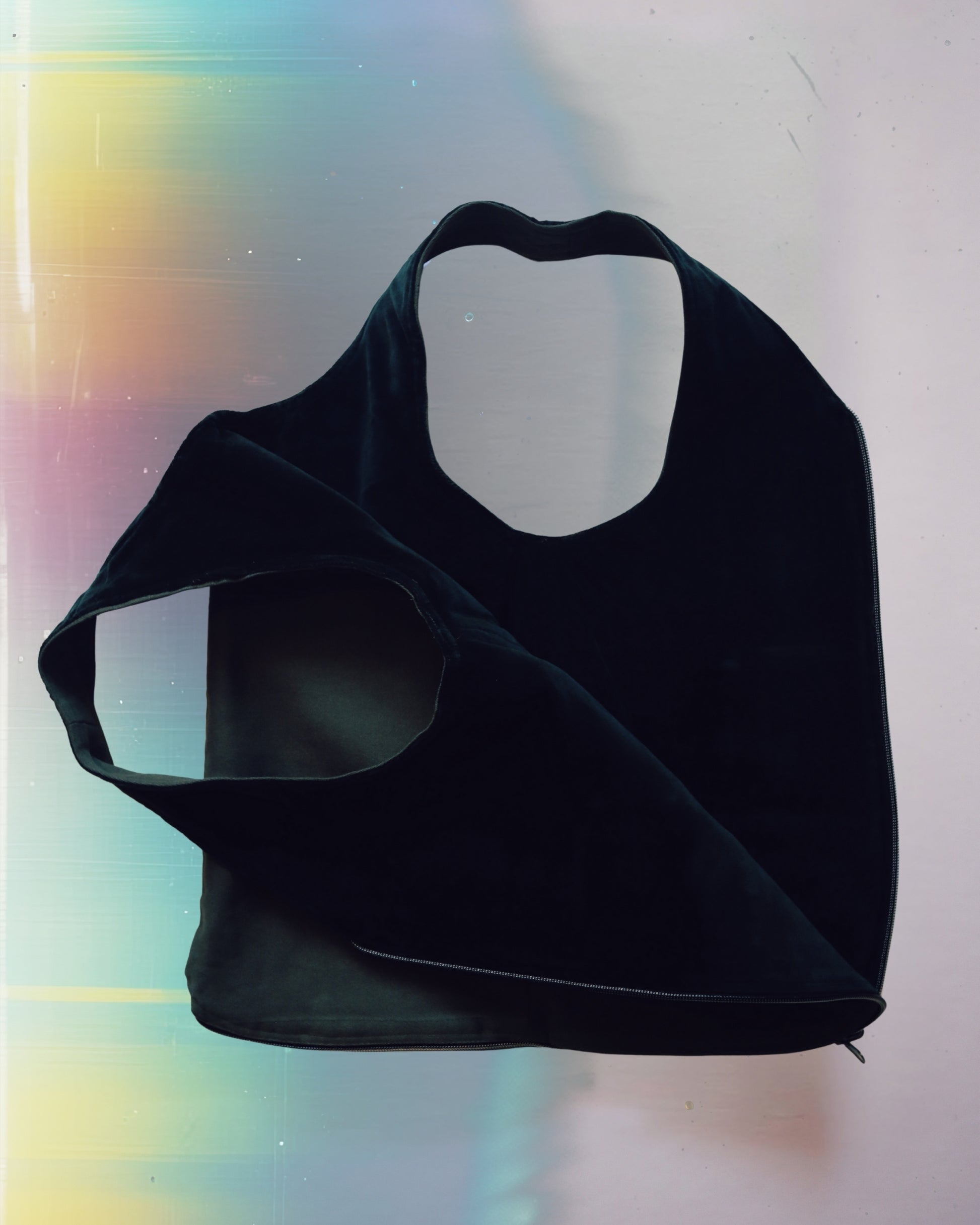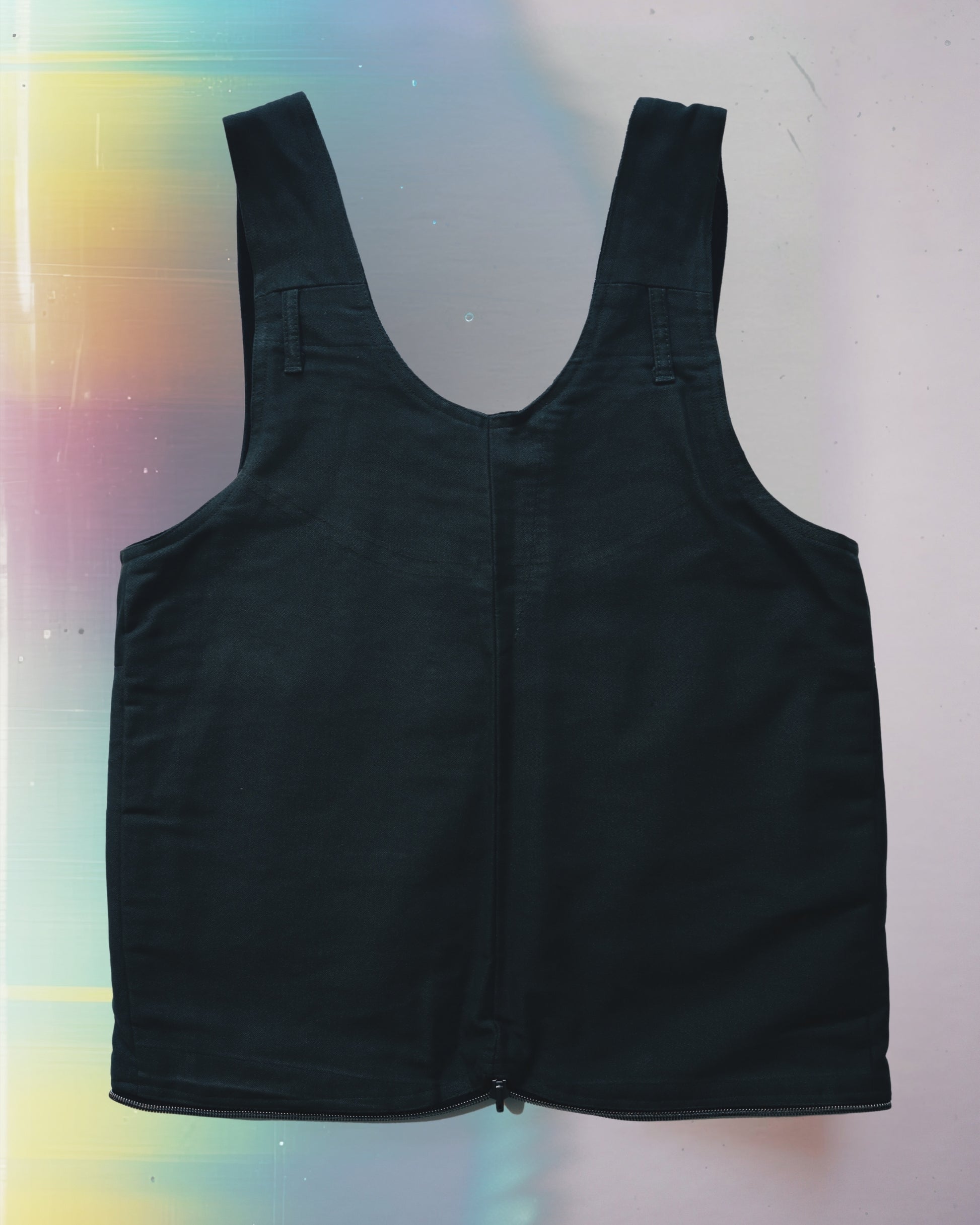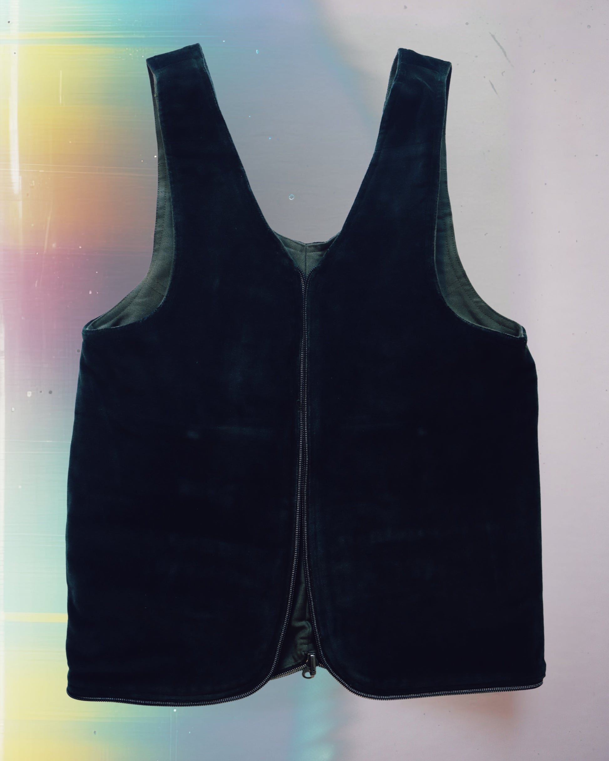 A medium size vest bag handcrafted from upcycled materials. One-of-a-kind piece designed for versatility. Fully reversible, two styles and two colors. Use as a bag or a vest.