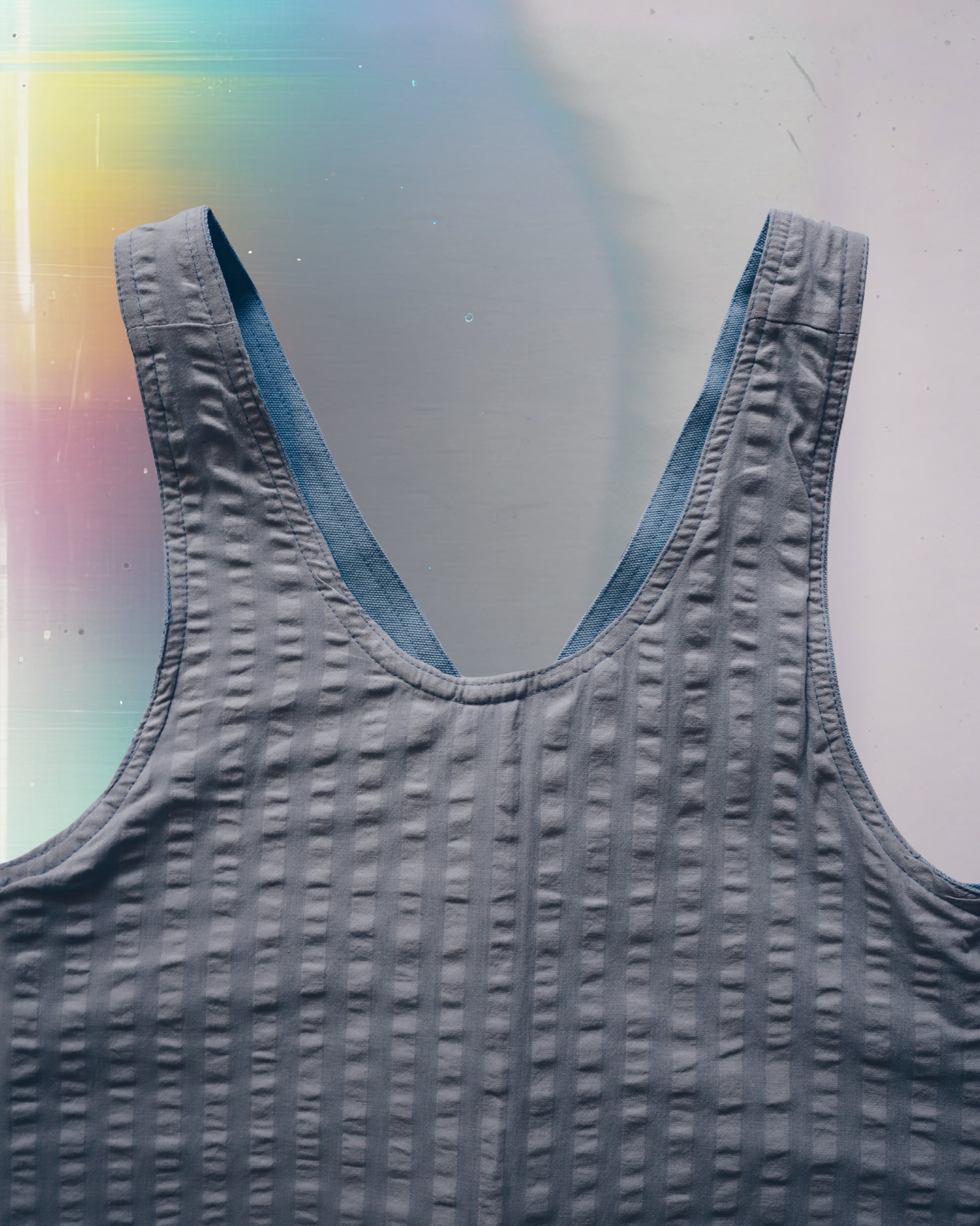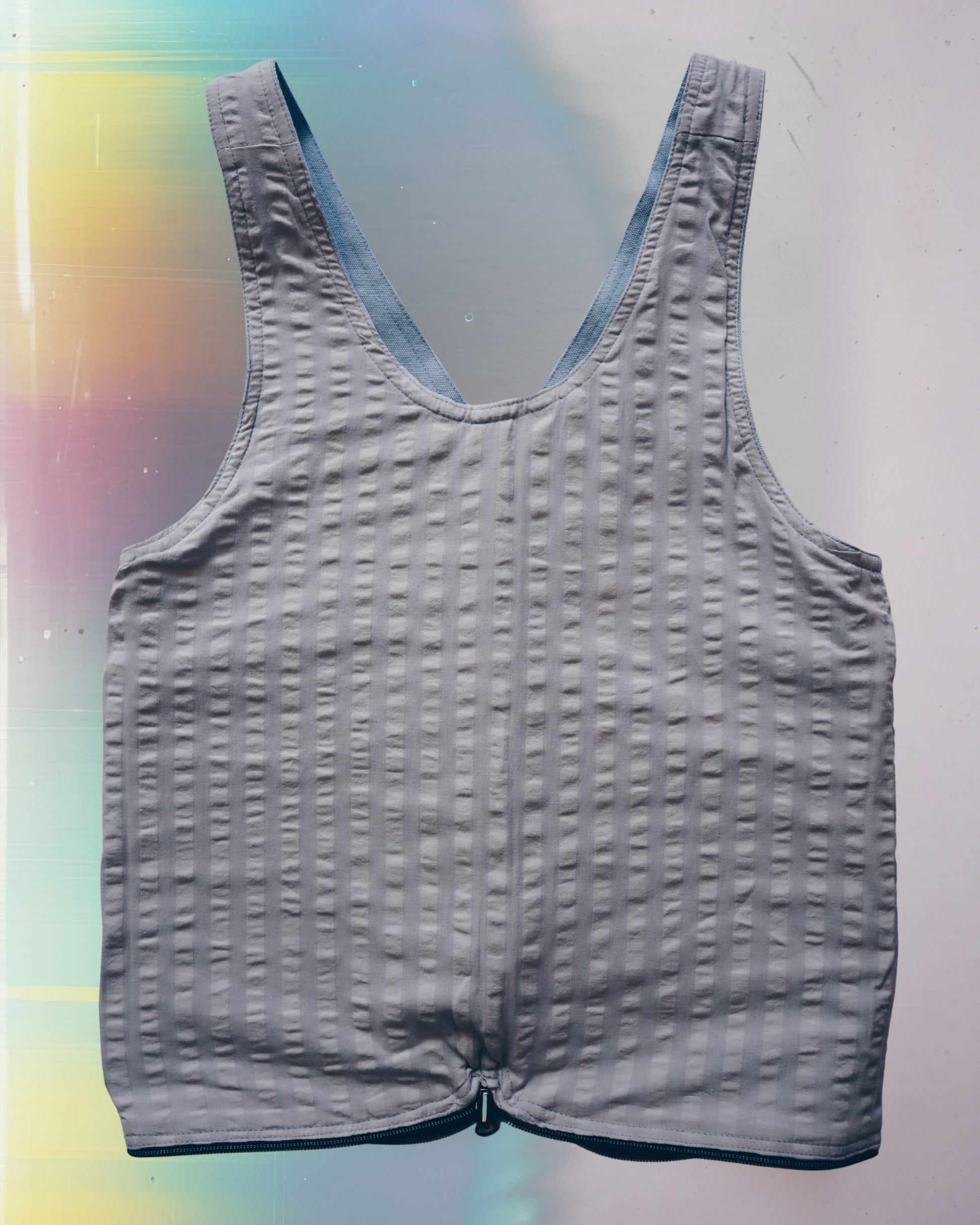 A medium size vest bag handcrafted from upcycled materials. One-of-a-kind piece designed for versatility. Fully reversible, two styles and two colors. Use as a bag or a vest.