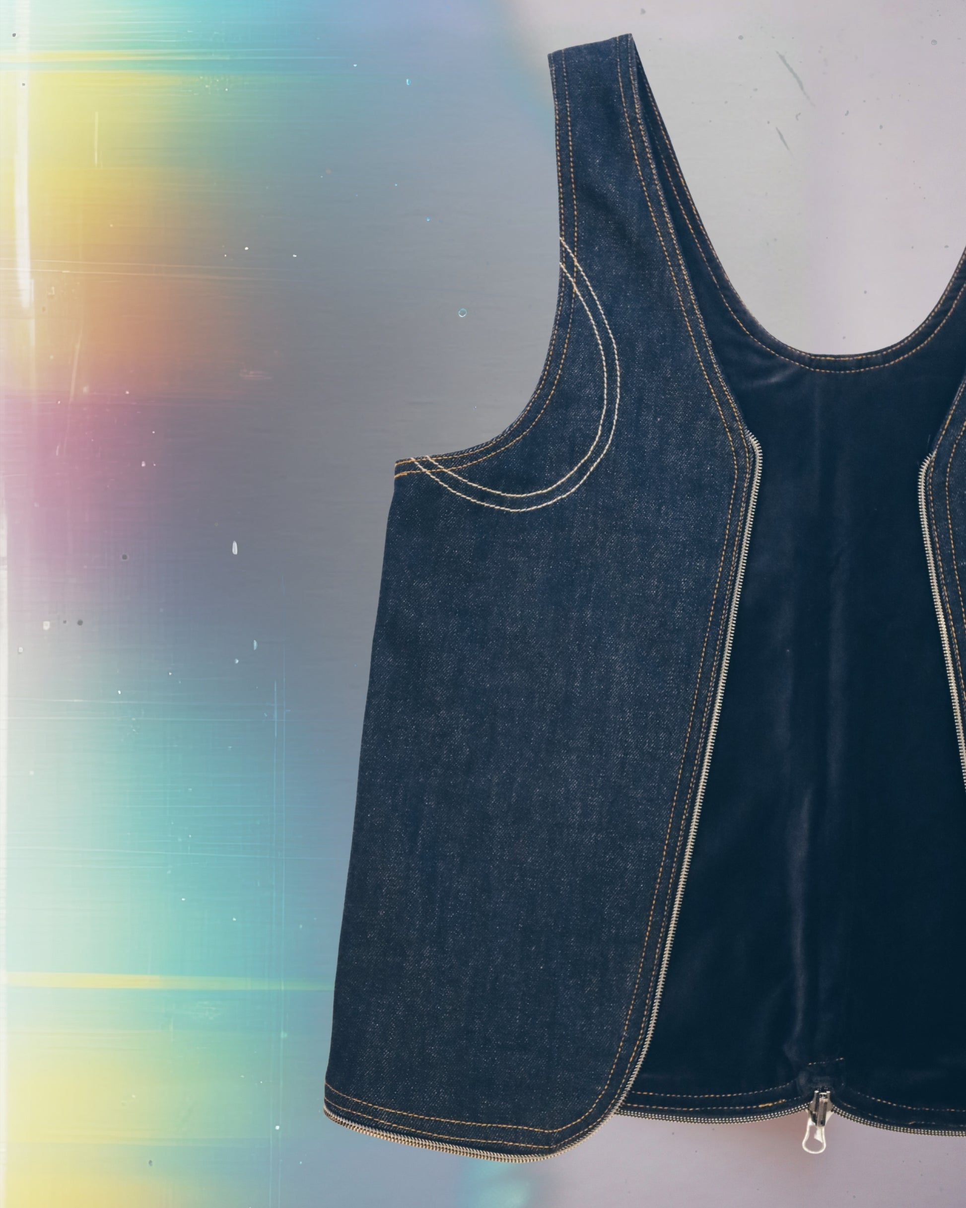 A medium size vest bag handcrafted from upcycled materials. One-of-a-kind piece designed for versatility. Fully reversible, two styles and two colors. Use as a bag or a vest.