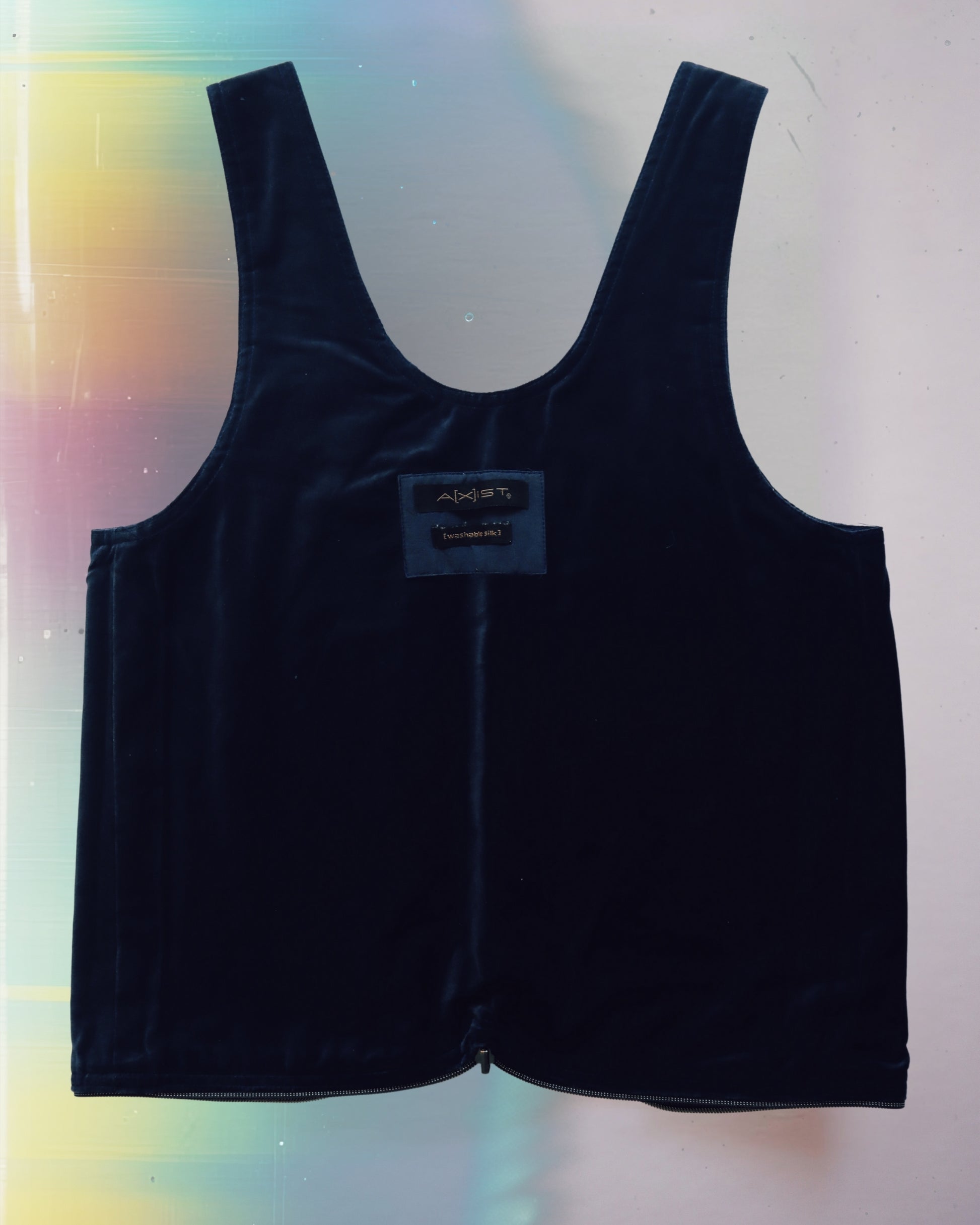 A medium size vest bag handcrafted from upcycled materials. One-of-a-kind piece designed for versatility. Fully reversible, two styles and two colors. Use as a bag or a vest.