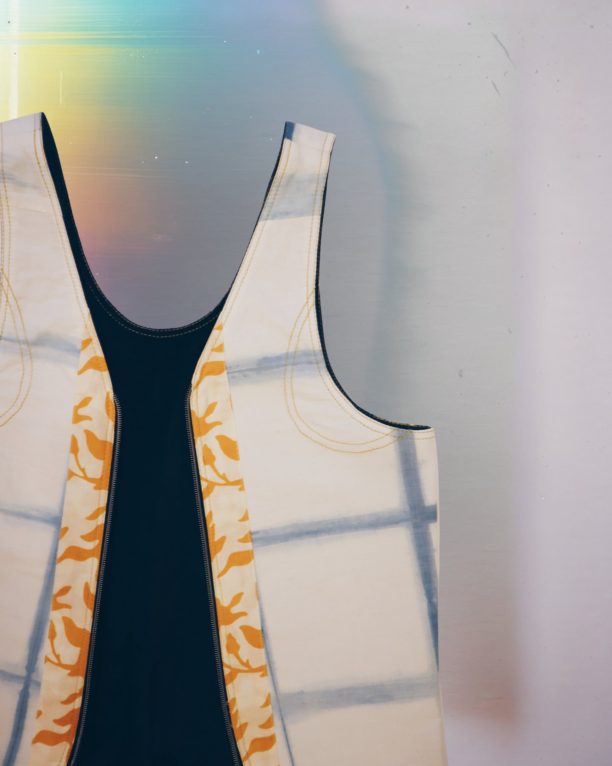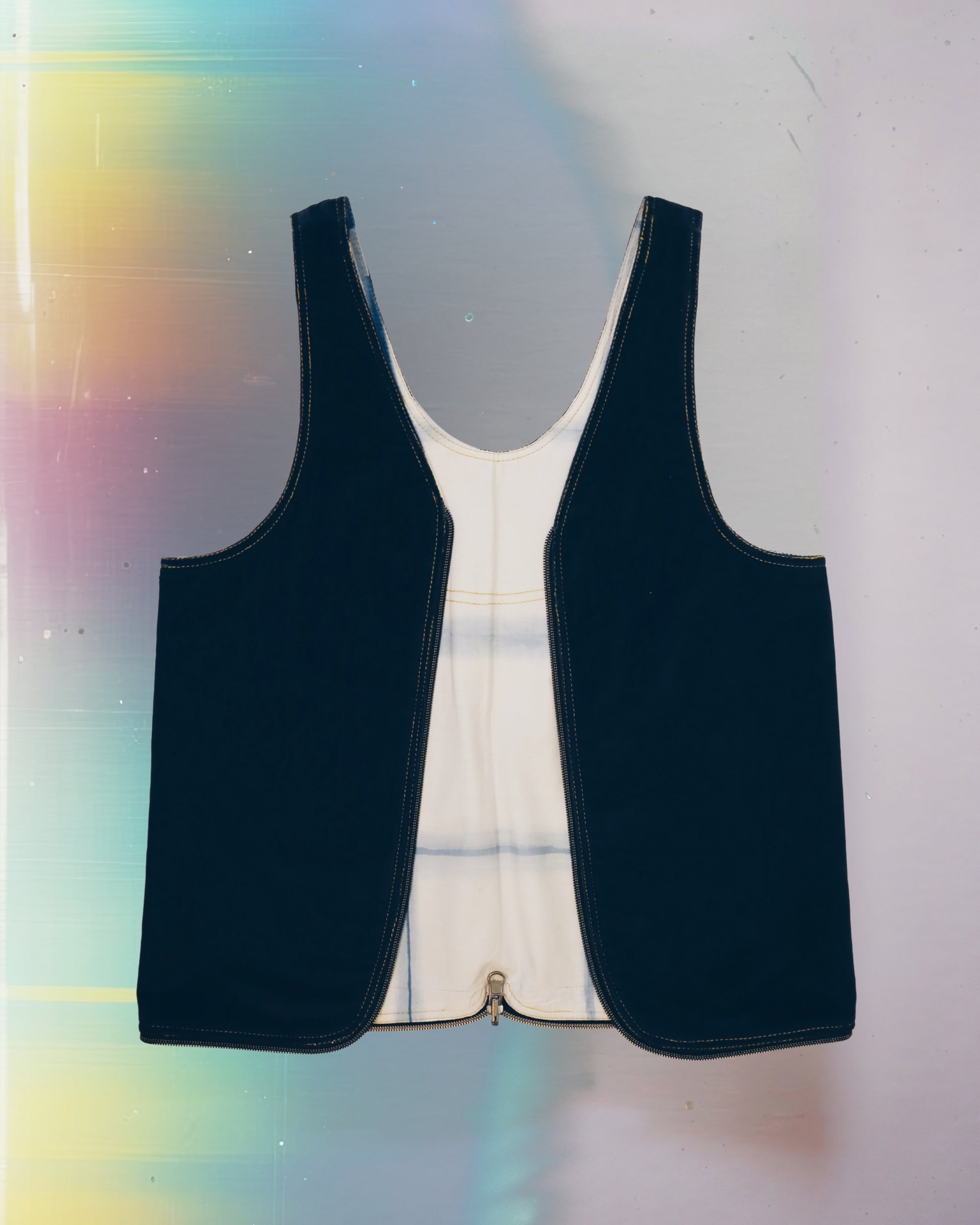 A medium size vest bag handcrafted from upcycled materials. One-of-a-kind piece designed for versatility. Fully reversible, two styles and two colors. Use as a bag or a vest.