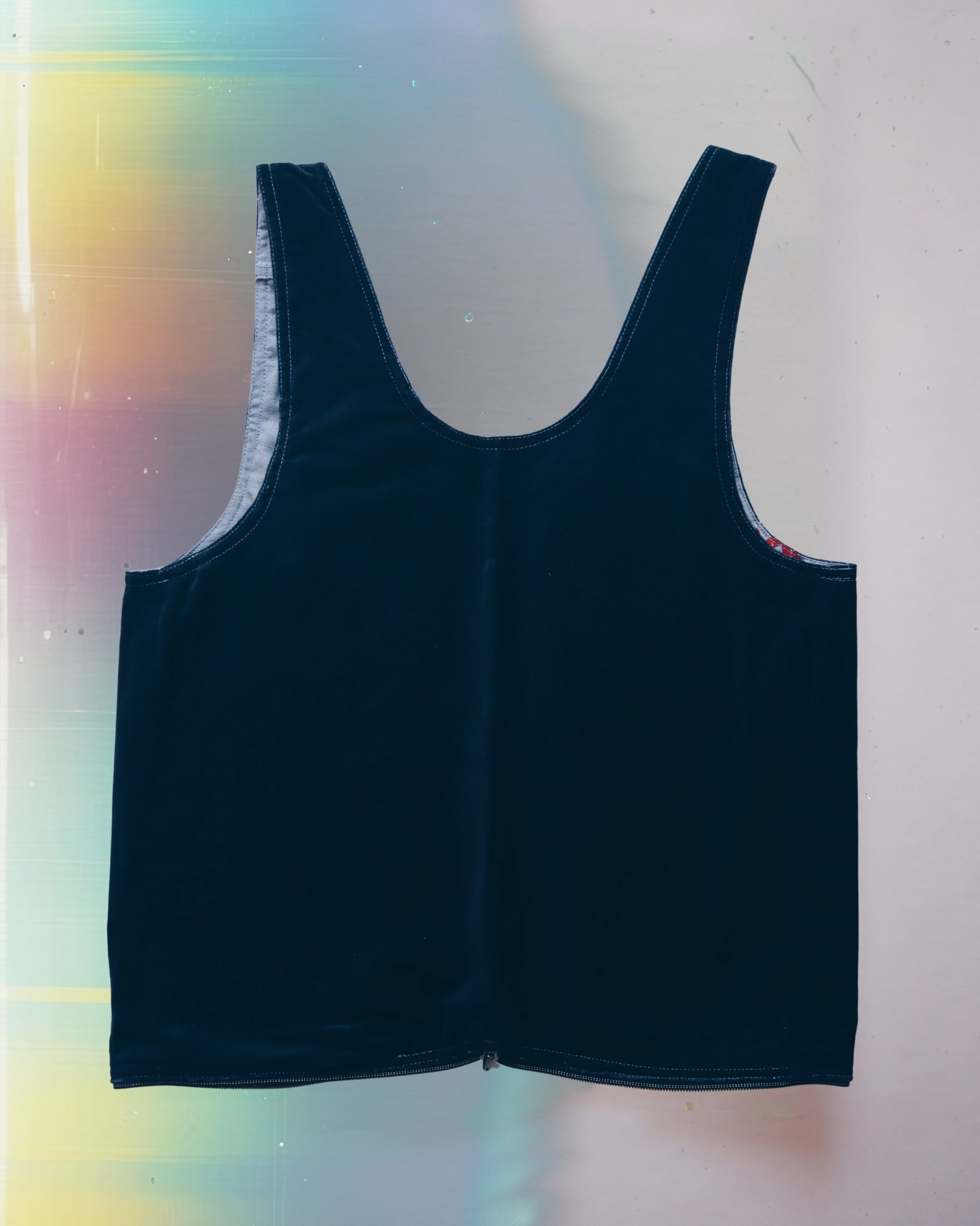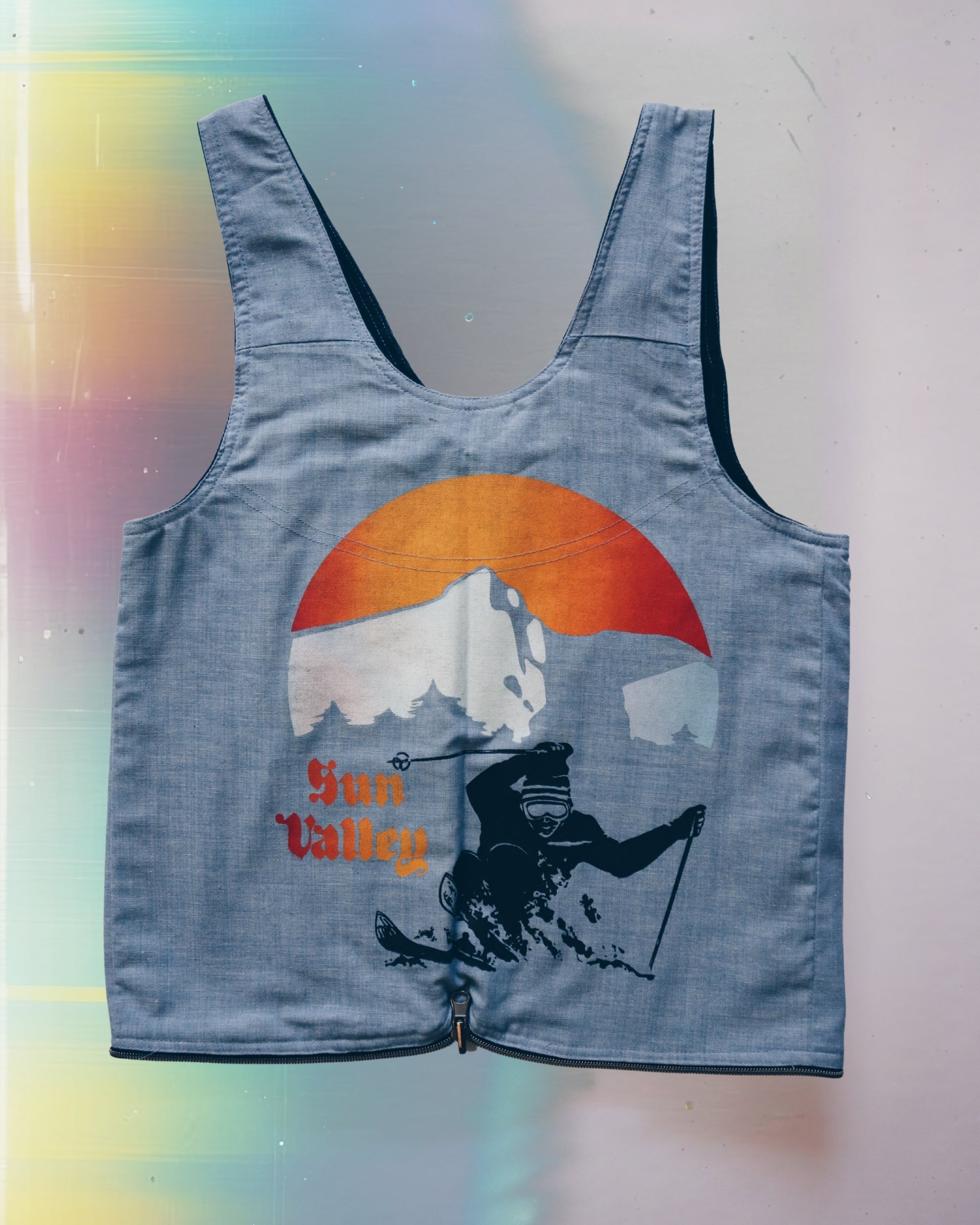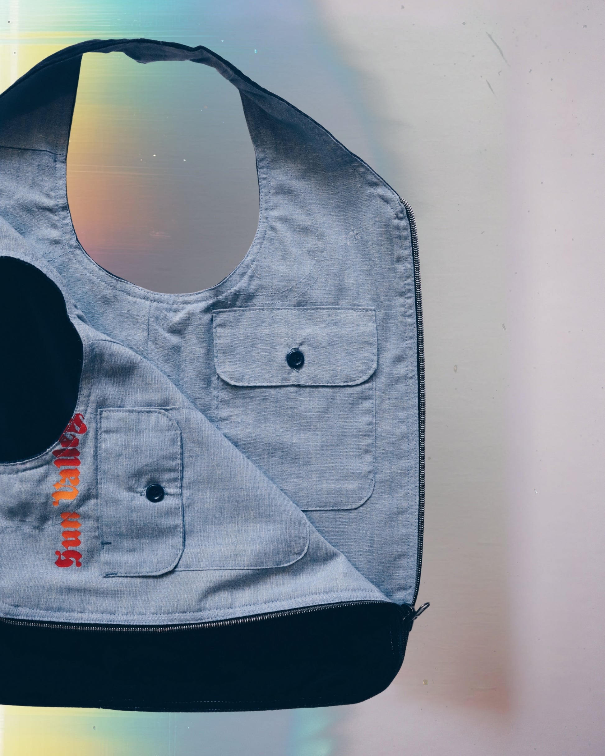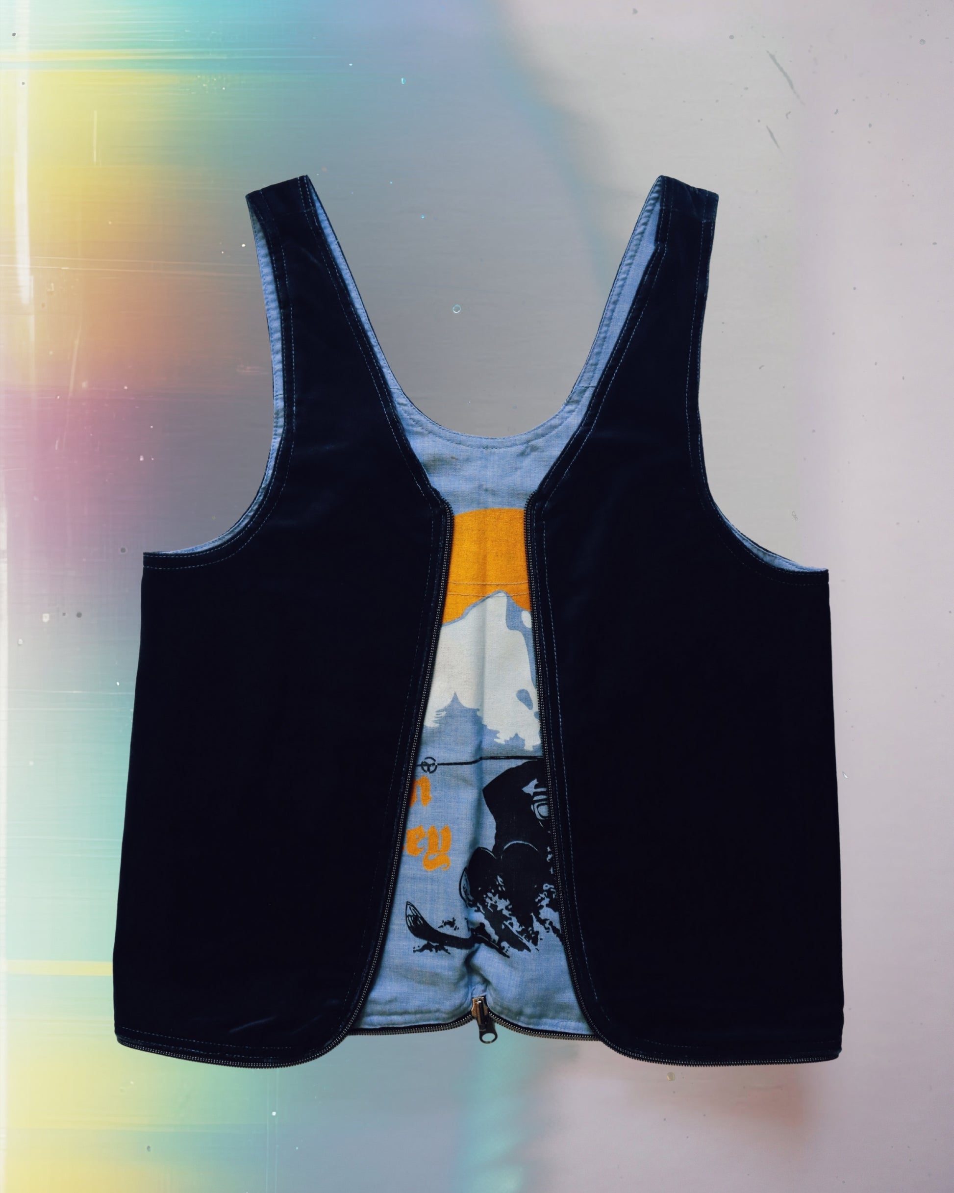 A medium size vest bag handcrafted from upcycled materials. One-of-a-kind piece designed for versatility. Fully reversible, two styles and two colors. Use as a bag or a vest.
