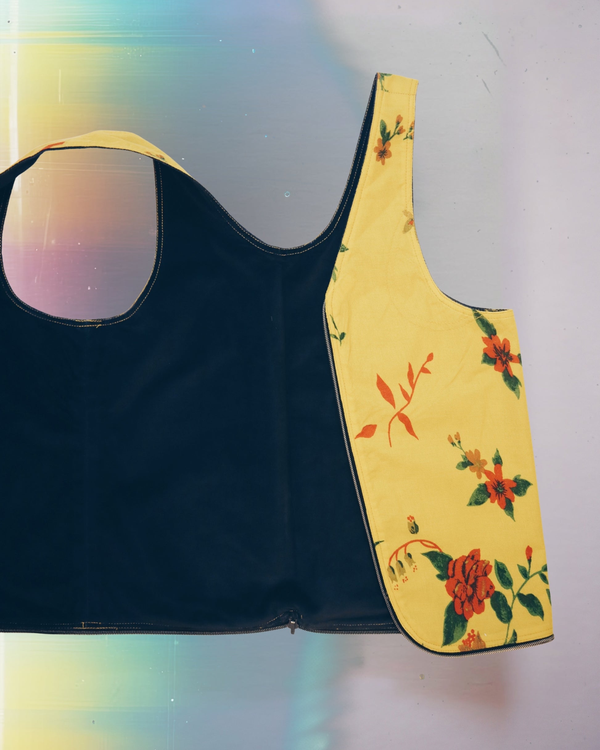 A medium size vest bag handcrafted from upcycled materials. Each one-of-a-kind piece is designed for versatility and is fully reversible, doubling as both vest and bag in two color options.