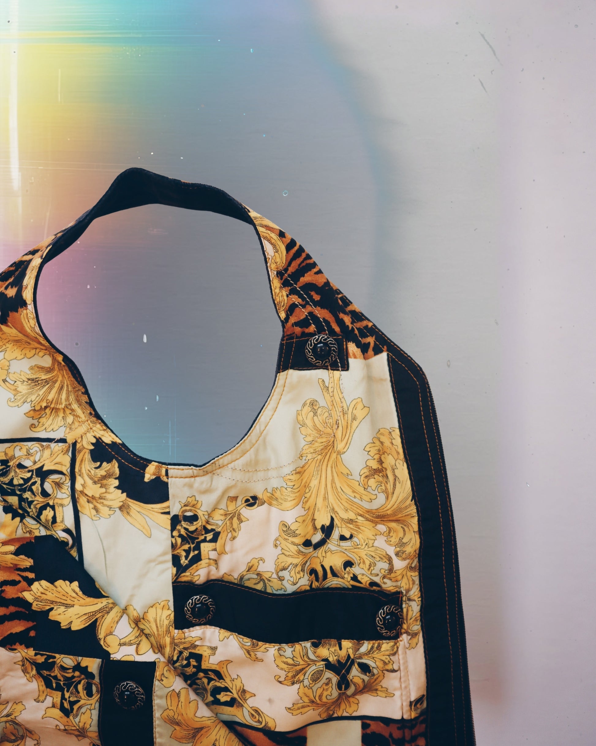 A medium size vest bag handcrafted from upcycled materials. One-of-a-kind piece designed for versatility. Fully reversible, two styles and two colors. Use as a bag or a vest.