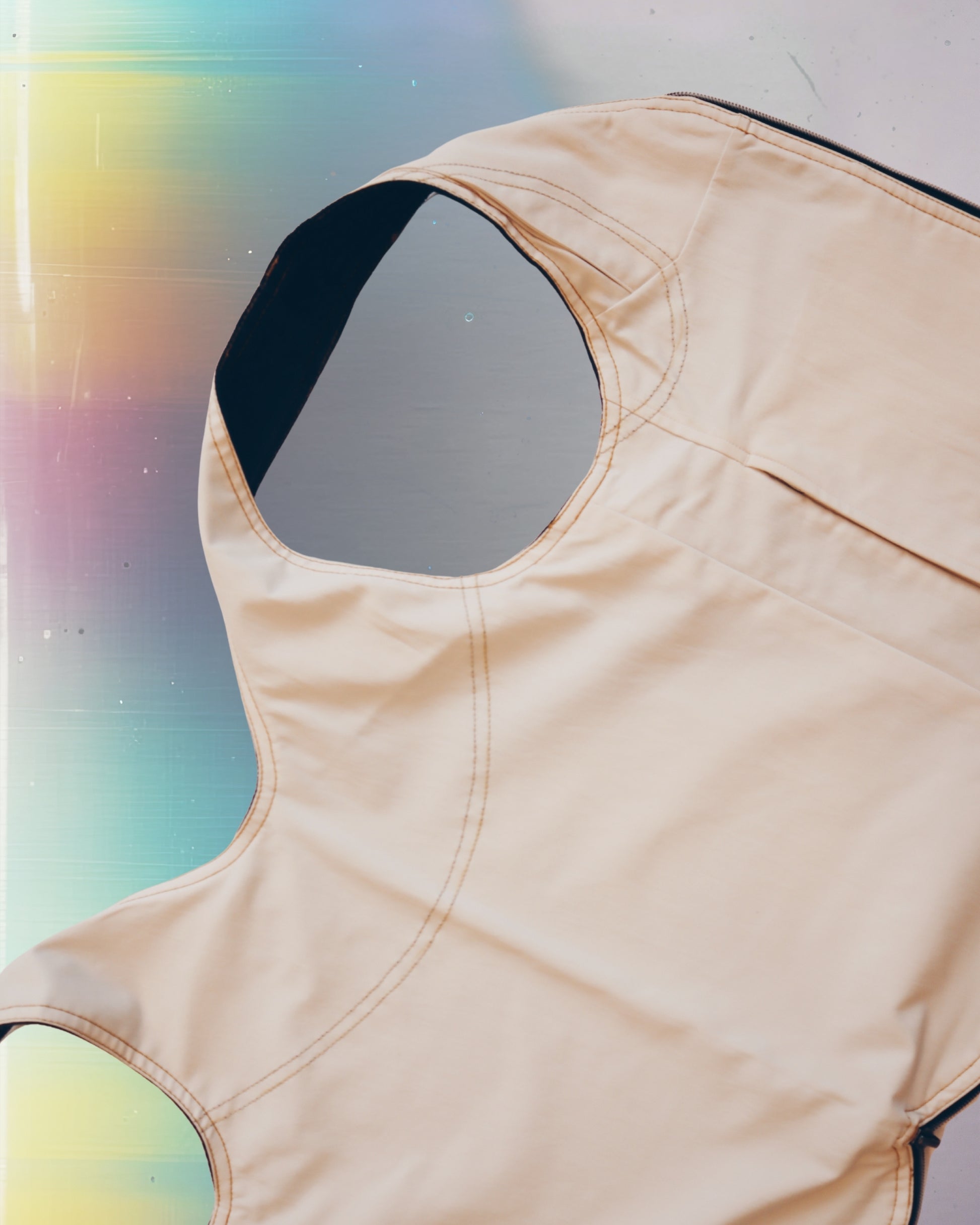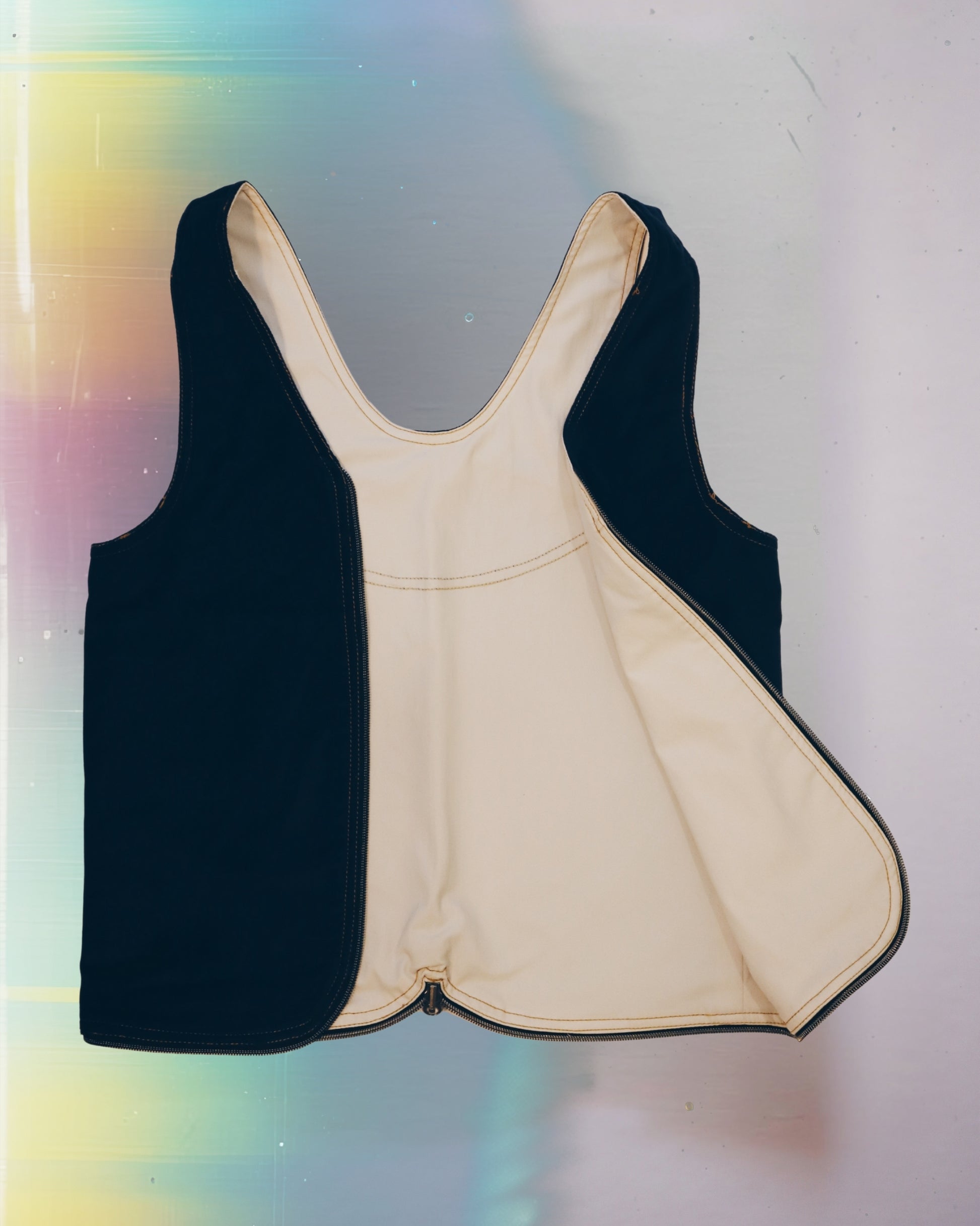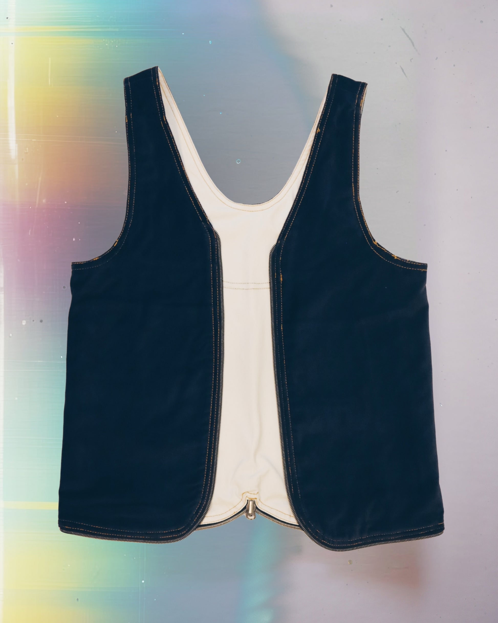 A medium size vest bag handcrafted from upcycled materials. One-of-a-kind piece designed for versatility. Fully reversible, two styles and two colors. Use as a bag or a vest.